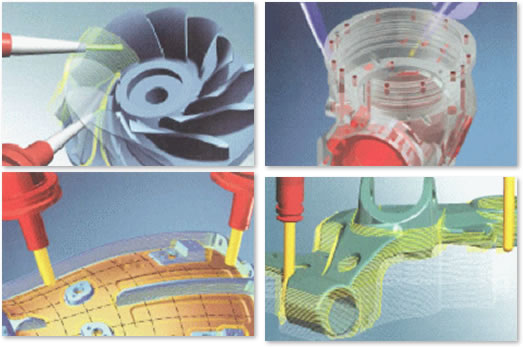これを用いてプログラミングを作成する事でムダが無く効率良い加工が実現できます。また、工具が入りにくい等の複雑な形状についても多彩な加工方法から干渉等の加工上起こり得る危険を考慮して最適な加工方法をシミュレーションし、インペラー・羽根車・ブリスク等の削り出しにおいて高品質な加工を達成しています。