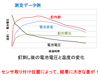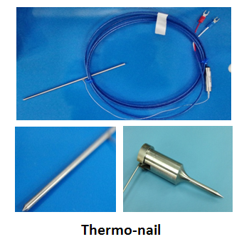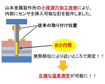 | 熱電対とは、2種類の異なる金属線を先端で接合した(対にした)温度センサであり、両端の温度差に応じて発生する微弱な電圧(熱起電力)を利用する事で温度測定を行います。 中高温領域用の温度センサとして広く用いられており、バラツキが小さい、耐食性・耐熱性が高いという特徴があります。 なお、熱電対の種類や素線径等については各種規格(IEC、JIS、ANSI他)により定められており、必要に応じて選択する必要があります。 山本金属では、熱電対に自社の小径深穴加工技術を融合させ、温度計測ツール「Thermo-nail」を開発致しました。 また応答性においても誤差はほとんどありませんので安心してお使い頂けます。 御興味がございましたら気軽にお問合せ下さい。 |